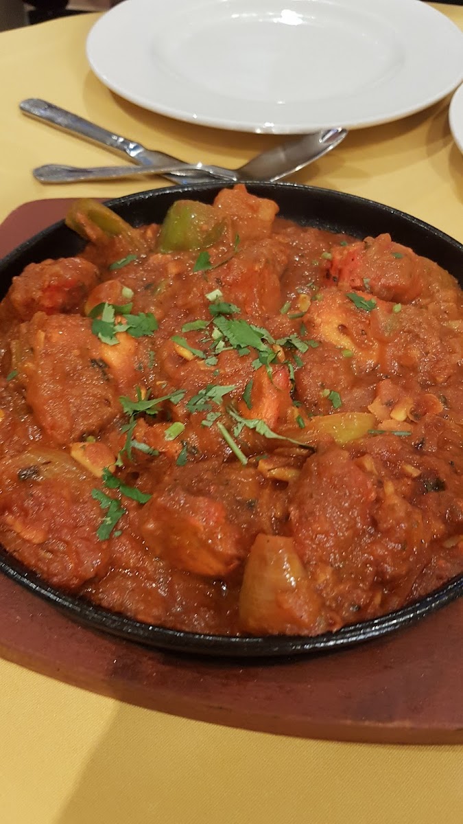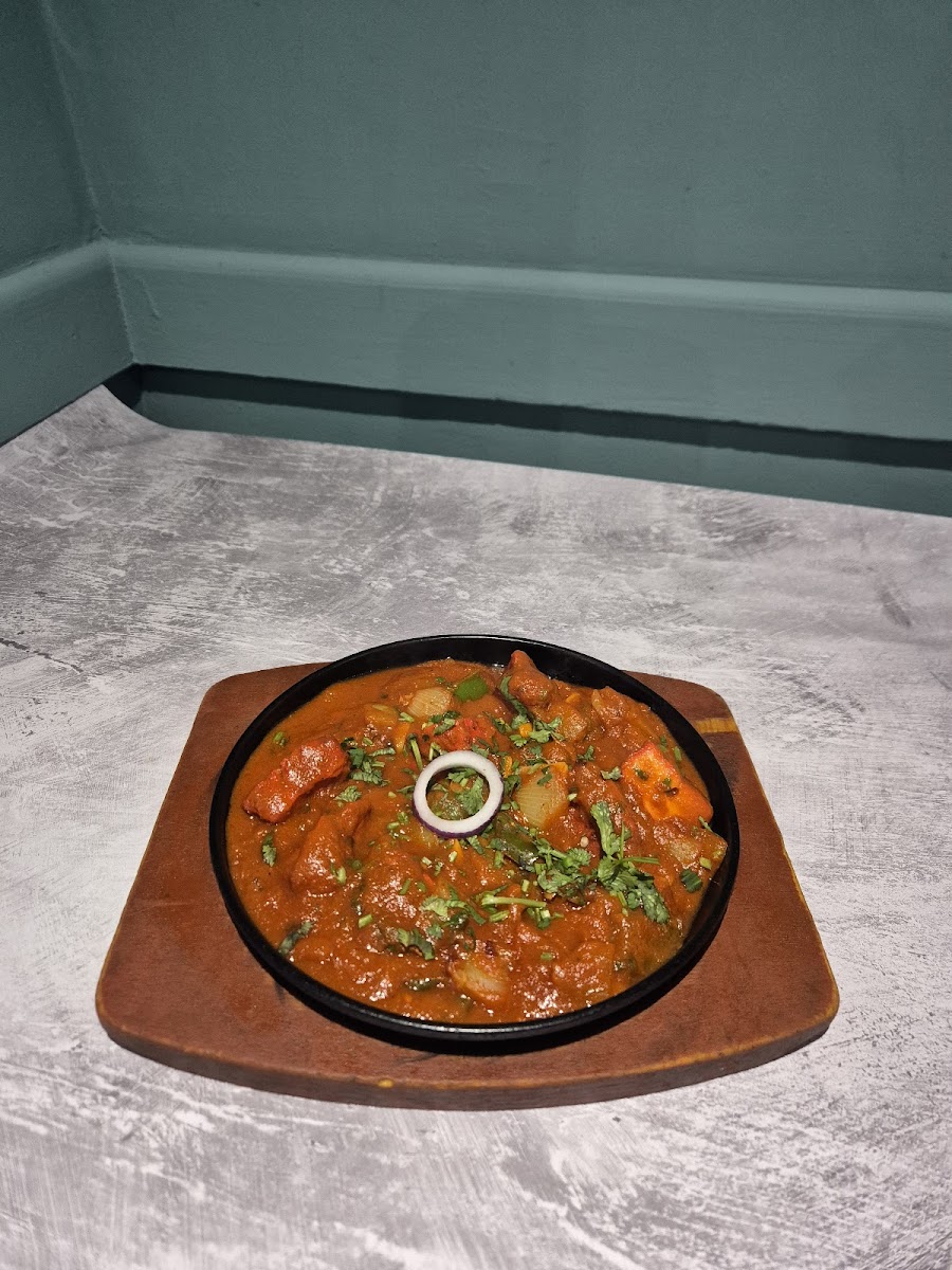 Chicken or Lamb Shashlik Balti: A flavorful dish of grilled meat served with vegetables in a tangy sauce, cooked to perfection.